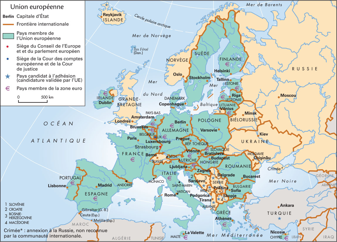 En 1951, six pays (République fédérale d’Allemagne, Belgique, France, Italie, Luxembourg, Pays-Bas) décident de mettre en commun leur production de charbon et d’acier. En 1957, ils signent ensemble le traité de Rome, instituant la Communauté économique européenne, ou Marché commun, qui réduit en particulier les droits de douane entre ces pays. La CEE développe une politique agricole commune. En 1992, le traité de Maastricht est signé par douze pays : il renforce la cohésion de la CEE, qui devient désormais l’Union européenne. Aujourd’hui l’UE est un grand marché, formé par vingt-sept pays, où circulent librement les marchandises, les capitaux et les habitants de ses États membres. Le 1er janvier 1999, l’euro est devenu la monnaie officielle unique d’une grande partie des États de l’Union (mise en circulation des billets et des pièces le 1er janvier 2002). La production des vingt-sept pays fait de l’UE une des premières puissances économiques mondiales. Une grande partie des législations nationales dépend désormais des décisions prises au niveau européen mais l’union politique reste cependant encore à construire. Après le rejet par les Français et les Néerlandais d’un projet constitutionnel en 2005, le traité de Lisbonne, signé en décembre 2007 et entré en vigueur, après ratification, le 1er décembre 2009, contribue notamment à étendre les attributions du Parlement européen (déjà élu au suffrage universel direct), à limiter les décisions prises à l’unanimité par les chefs d’État et de gouvernement (réduisant ainsi leur pouvoir de blocage) et à renforcer le rôle international de l’Union européenne. En 2020, suite à un référendum (2016), le Royaume-Uni quitte l’Union européenne, en application de l’article 50 du traité de Lisbonne.