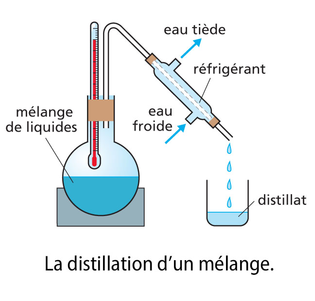 On peut obtenir de l'eau pure par distillation d'un mélange. En portant un mélange de liquides à ébullition, puis en refroidissant les vapeurs obtenues, on sépare ses constituants. La réfrigération est souvent réalisée grâce à un courant d'eau froide.