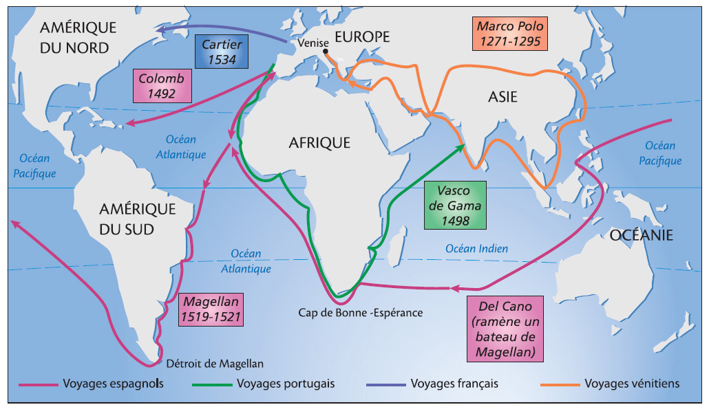 Épices, coton de l’Inde, soie et porcelaine de Chine sont en Europe des denrées rares et prisées. Le Vénitien Marco Polo (1254-1324) est le premier à donner de l’Orient (et de la Chine en particulier) une description précise. Entre l’Europe chrétienne et l’Asie orientale se dresse cependant le monde musulman. Pour éviter les risques que comportent les longs trajets terrestres, Portugais et Espagnols envisagent de rallier l’Asie par voie maritime. Trois instruments permettent alors aux marins de se repérer : la boussole, l’astrolabe et le portulan. En 1487, le Portugais Dias atteint le cap de Bonne-Espérance. Le Génois Christophe Colomb tente à son tour, au moyen de caravelles frétées par l’Espagne, d’arriver en Inde en empruntant cette fois la route de l’ouest : en 1492, il aborde en réalité les Antilles, puis le continent qu’on nommera plus tard l’Amérique. En 1498, le Portugais Vasco de Gama atteint l’Inde en contournant l’Afrique. En 1498, l’Italien Cabot (pour le compte de l’Angleterre) et, en 1534, le Français Cartier explorent les rivages de l’Amérique du Nord. En 1500, le Portugais Cabral atteint le Brésil. En 1522 s’achève l’expédition entreprise en 1519 par Magellan, qui réussit à doubler le cap Horn. Avec le premier tour du monde, preuve est désormais faite que la Terre est ronde.
