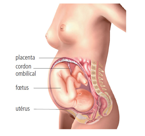 • la vie fœtale, qui dure 7 mois et correspond surtout à une croissance accélérée du bébé (qu’on appelle alors fœtus). Les échanges alimentaires et respiratoires entre le fœtus et l’organisme maternel sont réalisés à travers le placenta, grâce au cordon ombilical.