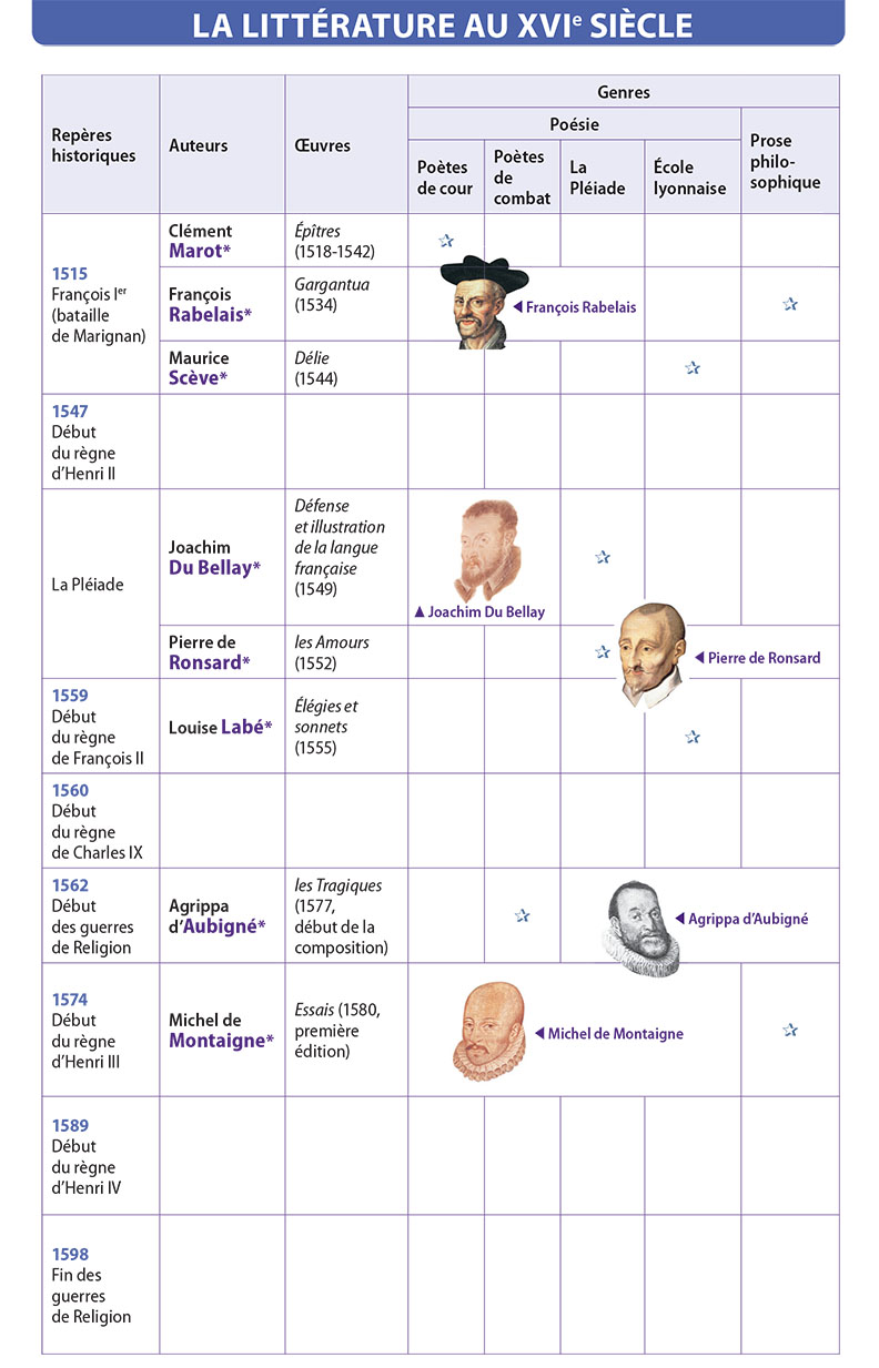 Le xvie s. hérite du Moyen Âge une grande maîtrise de la versification grâce aux « rhétoriqueurs » (nom donné à l’époque aux spécialistes de la grammaire, de la poésie et de la construction du discours). L’attrait pour l’Antiquité grecque et romaine est renouvelé par les découvertes culturelles, réalisées à l’occasion des guerres d’Italie sous François Ier (1515). Avec la naissance du protestantisme, les questions religieuses sont une source de division entre les Français ; les réactions partisanes donnent naissance à une poésie engagée.