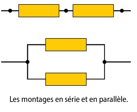 Deux dipôles peuvent être reliés l’un à la suite de l’autre (on dit qu’ils sont branchés en série), ou reliés l’un à l’autre par leurs deux bornes (on dit qu’ils sont branchés en dérivation ou en parallèle).
