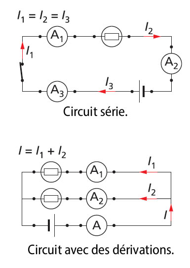 Dans un circuit avec des dérivations, l’intensité qui passe dans la branche principale est égale à la somme des intensités qui passent dans les branches dérivées.