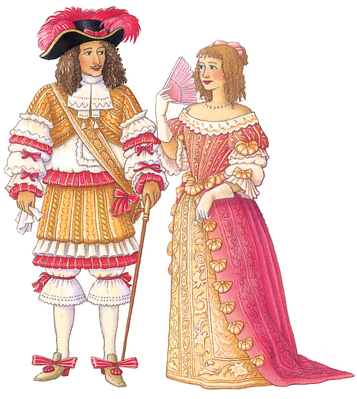 Costumes français vers 1660. Seigneur en rhingrave-jupon avec rabat au cou et canon de dentelle aux jambes. Dame en robe et manteau traînant.