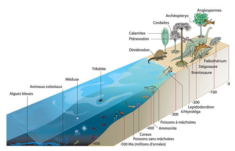 La combinaison des observations des géologues et de celles des paléontologues permet de reconstituer progressivement une histoire des milieux et des conditions de vie sur la Terre, depuis l’apparition de la vie il y a 3,8 milliards d’années.
