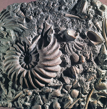 Les fossiles* sont des restes ou des traces d’êtres vivants conservés dans une roche. Ils témoignent des milieux de vie passés. Par exemple, on sait que les mollusques céphalopodes actuels sont tous marins : aussi, la découverte d’ammonites (céphalopodes fossiles de l’ère secondaire) dans une couche de sédimentation indique-t-elle qu’à cet endroit se trouvait jadis la mer. De même, la découverte en Antarctique de fossiles de plantes et de plancton caractéristiques des climats chauds actuels montre que le climat de cette région était subtropical il y a 55 millions d’années.