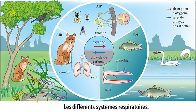 Les êtres vivants – qu’ils soient animaux ou végétaux – respirent constamment. Ce phénomène vital se traduit par des échanges gazeux entre les organismes vivants et leur milieu de vie : absorption de dioxygène (oxygène à l’état de gaz) et rejet de dioxyde de carbone. La diversité des organes respiratoires permet aux animaux d’occuper tous les milieux. Ces organes respiratoires (poumons, branchies, trachées) ont en commun la finesse des parois et l’étendue des surfaces d’échange.