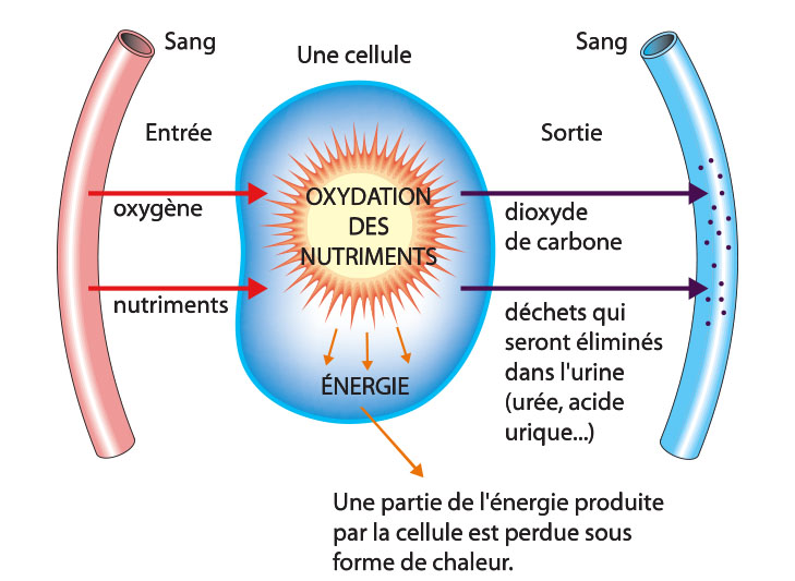 Le dioxygène absorbé dans le cadre de la respiration est utilisé au sein des cellules : il est consommé au cours d’un ensemble de réactions chimiques d’oxydation dans lesquelles les cellules dégradent des nutriments pour produire de l’énergie. L’énergie ainsi libérée est en partie consommée par l’activité cellulaire et en partie dissipée sous forme de chaleur. Cette dégradation des nutriments produit des déchets, notamment le dioxyde de carbone, qui devront être éliminés par l’organisme.