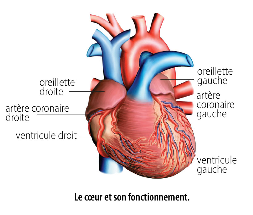 La circulation du sang dans notre organisme est mise en action par le cœur qui joue le rôle d’une double pompe. Une cloison sépare le « cœur gauche » et le « cœur droit ». Les contractions rythmiques du muscle cardiaque, ou myocarde, propulsent le sang dans un sens imposé par des valvules. Si une des artères coronaires est rétrécie et se bouche, les cellules cardiaques normalement alimentées par cette artère sont privées de nutriments et de dioxygène et meurent : c’est l’infarctus. Un infarctus est en général la conséquence d’une maladie des parois des artères : l’artériosclérose (durcissement et épaississement des parois). Elle est favorisée par trois principaux facteurs de risque : l’hypertension, l’excès de poids et le tabagisme, et s’accompagne fréquemment du dépôt de plaques de lipides (plaques d’athérome) sur les parois artérielles (c’est ce qu’on appelle l’athérosclérose).