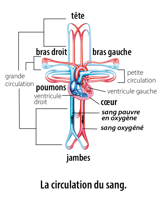 Le sang circule dans un système clos, formé de vaisseaux de calibres très différents : artères aux parois épaisses qui transportent le sang depuis le cœur vers les autres organes, veines aux parois plus fines qui conduisent le sang des organes vers le cœur et au niveau des cellules qui composent les différents organes, capillaires microscopiques (sanguins et lymphatiques), qui assurent les échanges de dioxygène, nutriments et déchets. La circulation sanguine se fait à sens unique.