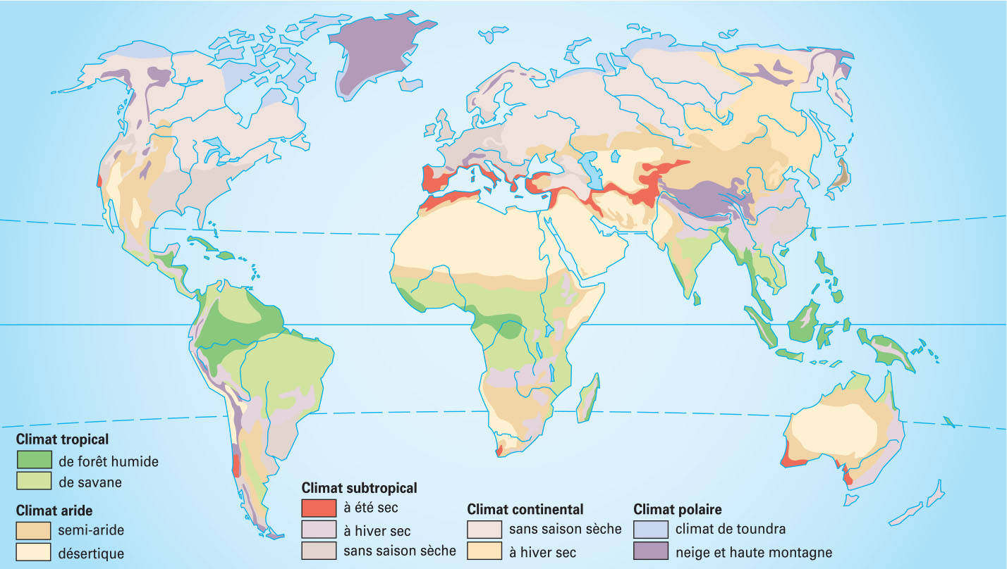 Les zones chaudes de la Terre sont principalement localisées autour de l’équateur, entre les tropiques ou à proximité d’eux. Le Soleil y est toujours haut dans le ciel : il fait donc chaud toute l’année. Le climat équatorial se caractérise par des pluies abondantes et régulières tout au long de l’année. La forêt dense constitue le paysage naturel des régions équatoriales. Le climat tropical se caractérise par l’irrégularité des pluies : abondantes durant la saison humide, rares durant la saison sèche. La forêt claire et la savane forment le paysage naturel des régions tropicales. Au fur et à mesure qu’on s’éloigne de l’équateur, on passe progressivement d’un climat tropical sec à un climat semi-aride, puis aride, caractérisé par l’extrême rareté des pluies. La steppe et les étendues de sable constituent les paysages naturels des régions semi-arides et arides.