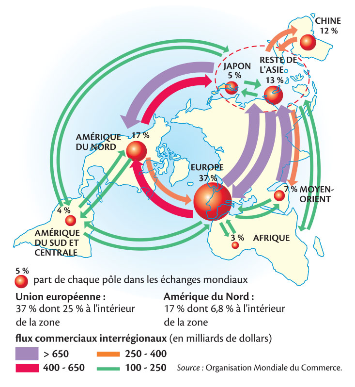 Depuis le milieu des années 2000, la Chine a émergé dans le commerce international dominé jusqu’alors par la « triade » U.E./États-Unis/Japon. Les pays développés pratiquent entre eux des échanges commerciaux équilibrés, fondés sur la libre concurrence des entreprises et le libre choix des consommateurs. Les pays développés du Nord achètent aux pays en développement (PED) du Sud certaines denrées alimentaires (café, bananes...), des matières premières (caoutchouc, fer, phosphates...) et des sources d’énergie (hydrocarbures, uranium, charbon...) contre des produits finis à forte valeur marchande (automobiles, ordinateurs, machines agricoles) – qu’ils vendent aux pays du Sud. Mais, dans le cadre de cet échange, les pays du Sud accumulent de lourdes dettes envers les pays du Nord. En outre, les entreprises européennes et nord-américaines délocalisent de plus en plus une partie de leur production vers l’Asie, où elles bénéficient d’une main-d’œuvre à très bon marché.
