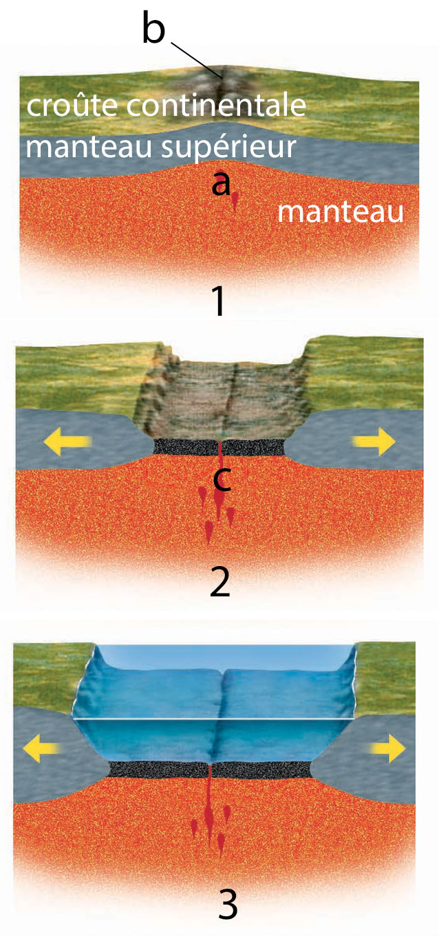 Un océan naît à l’intérieur d’un continent : 1. une montée de magma (a) bombe d’abord la croûte continentale, provoquant sa fissuration (b) ; 2. le magma basaltique parvient alors à s’infiltrer jusqu’en surface (c) tout en poussant les deux bords de l’ouverture ; 3. l’ouverture s’agrandit jusqu’à l’envahissement par la mer.