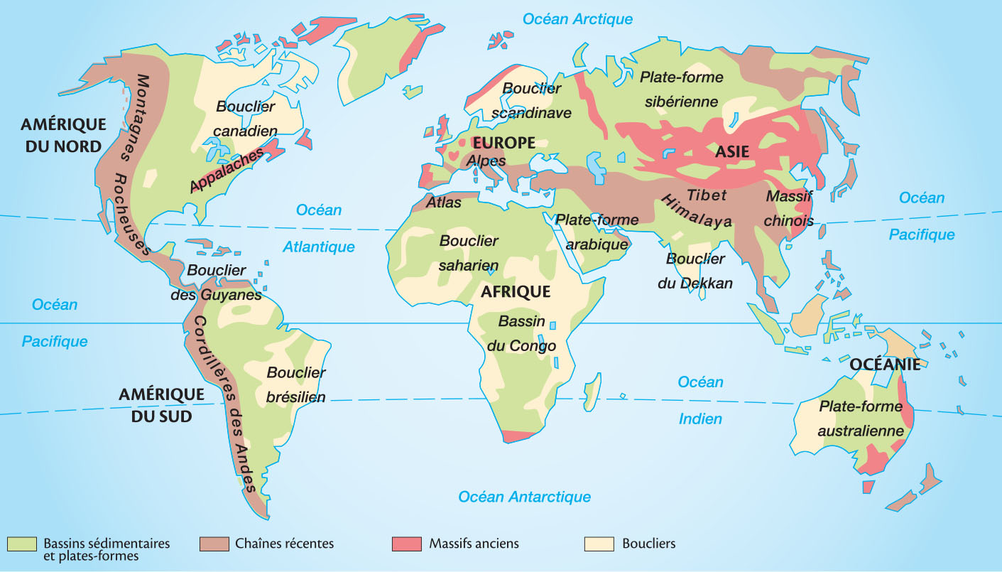 Les plaines et les plateaux sont des étendues plates. Les plaines sont situées au niveau des grands cours d’eau (rivières ou fleuves) ; les plateaux surplombent ces grands cours d’eau. Certaines hautes plaines peuvent avoir une altitude plus élevée que les bas plateaux. Les plaines côtières sont situées à proximité du littoral ; les plaines fluviales sont situées de part et d’autre d’un grand cours d’eau. Une vallée est une plaine fluviale encaissée au pied d’un relief plus élevé. On appelle « bouclier » un plateau très étendu, situé au cœur d’un continent ; c’est une ancienne montagne aplatie par l’érosion.
