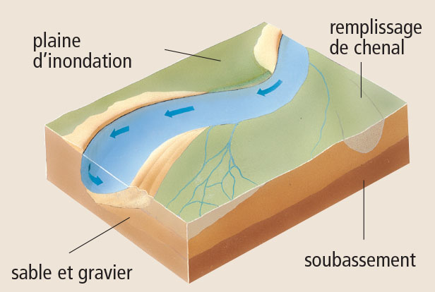 Une rivière au tracé en méandres érode sa rive concave, tandis que des alluvions se déposent sur sa rive convexe. Une crue provoque le dépôt immédiat, de part et d’autre du lit mineur, des galets et des graviers qui forment ainsi des levées ou digues naturelles, tandis que l’inondation du fond de vallée permet la sédimentation par décantation des limons fins en suspension.