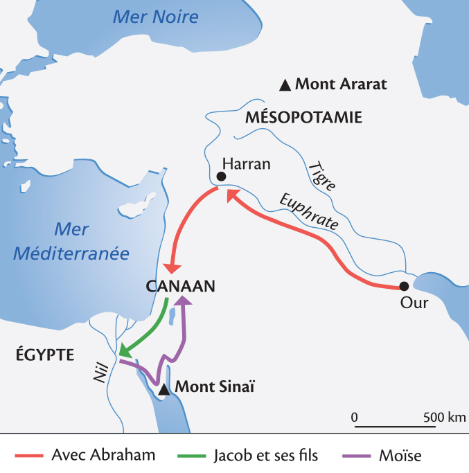 Les croyants des trois religions monothéistes – le judaïsme, le christianisme et l’islam – se proclament tous « fils d’Abraham ». Abraham, né à Our à l’embouchure de l’Euphrate, aurait, selon les textes religieux, entendu l’appel de Dieu lui demandant d’aller s’établir en terre de Canaan. La Bible évoque le parcours des Hébreux vers ce pays. Abraham aurait quitté la Mésopotamie vers 1800 av. J.-C. pour marcher vers la « Terre promise ». Les traditions juive et musulmane font des deux fils d’Abraham, Ismaël et Isaac, les fondateurs des peuples arabe (Ismaël) et juif (Isaac). Selon la Bible, le peuple élu séjourne en Égypte pendant plusieurs générations pour fuir la famine. Le prophète Moïse conduit le peuple hébreu hors d’Égypte vers 1250 av. J.-C. C’est l’Exode, durant lequel il reçoit de Yahvé (Dieu) les Tables de la Loi, sur lesquelles sont gravés les dix commandements.