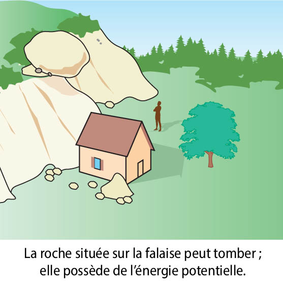 Certains corps possèdent de l’énergie de par leur position. Ainsi, par exemple, la roche (dessin ci-dessous) possède de l’énergie car elle peut tomber et provoquer l’écrasement de la maison située au-dessous. Cette énergie est appelée énergie potentielle de pesanteur.