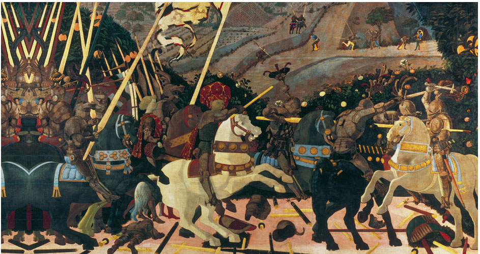 La Bataille de San Romano (vers 1438- 1440), huile sur bois de Paolo Uccello (National Gallery, Londres): dans cette composition, le traitement de la perspective, parfaitement maîtrisée, prend un caractère de jeu intellectuel.