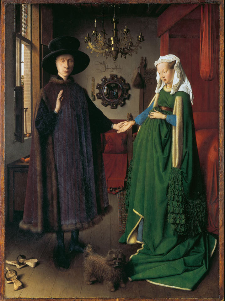 Arnolfini et sa femme (1434), huile sur bois de Jan Van Eyck (National Gallery, Londres): chez ce grand maître flamand de la technique à l’huile (le premier peut-être), l’attention portée aux détails concourt au réalisme des oeuvres.