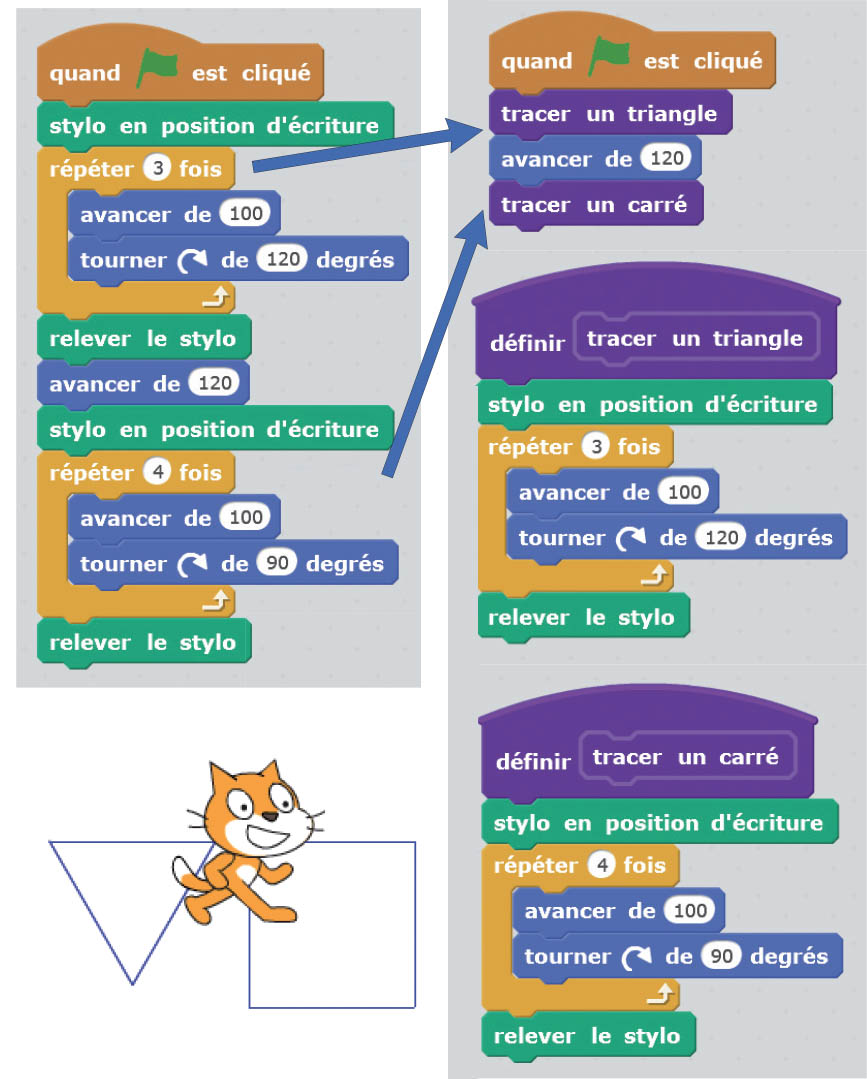 Par exemple, ici, nous avons inventé les instructions pour tracer un triangle et un carré en les nommant respectivement « tracer un triangle » et « tracer un carré » pour faciliter la compréhension du programme. Le lutin trace d’abord un triangle, avance de 120, puis trace un carré.