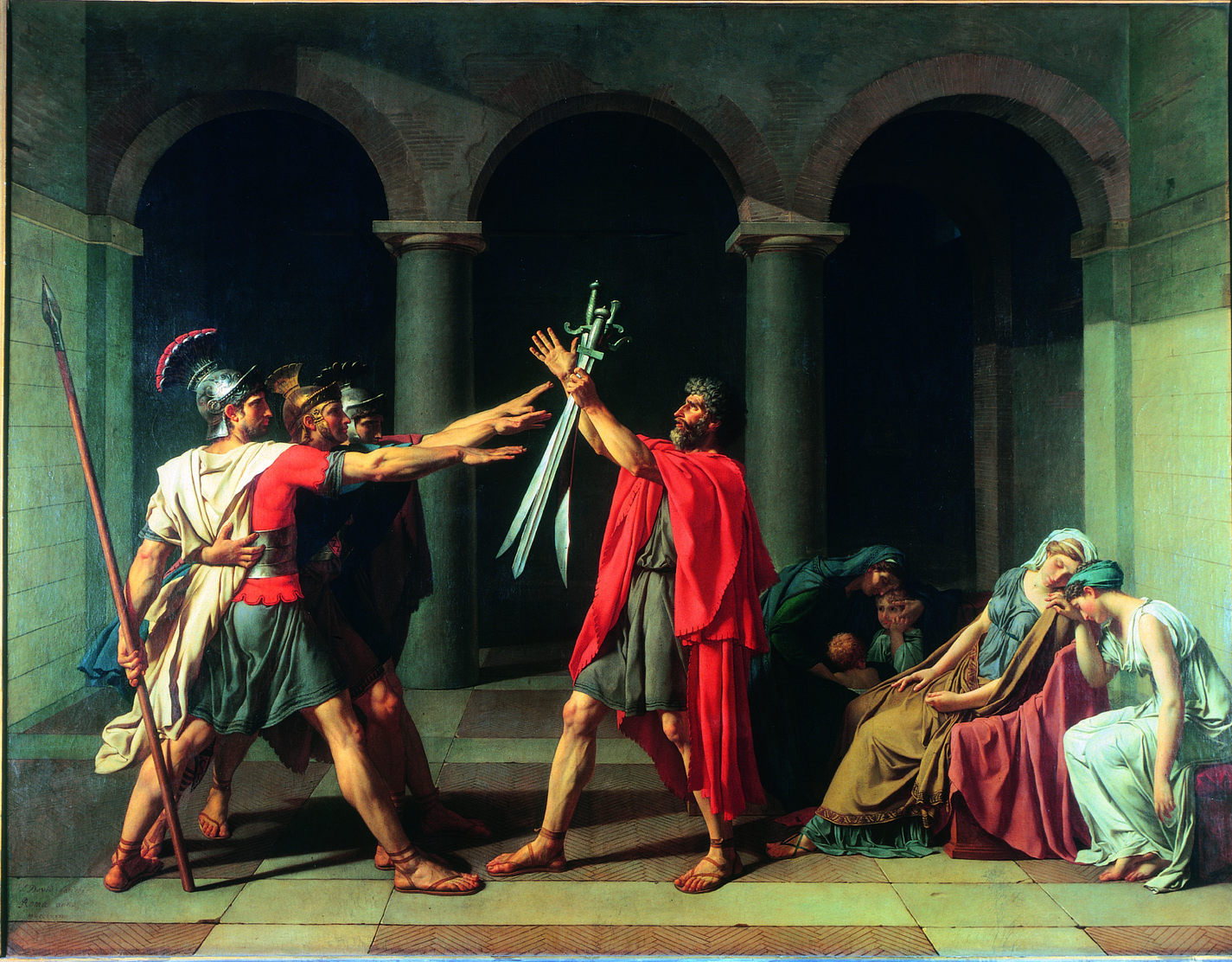 Le Serment des Horaces (1784), huile sur toile de Louis David (musée du Louvre, Paris): cette toile d'inspiration antique, peinte à Rome, apparut au Salon parisien de 1785 comme le manifeste de la jeune école néoclassique.