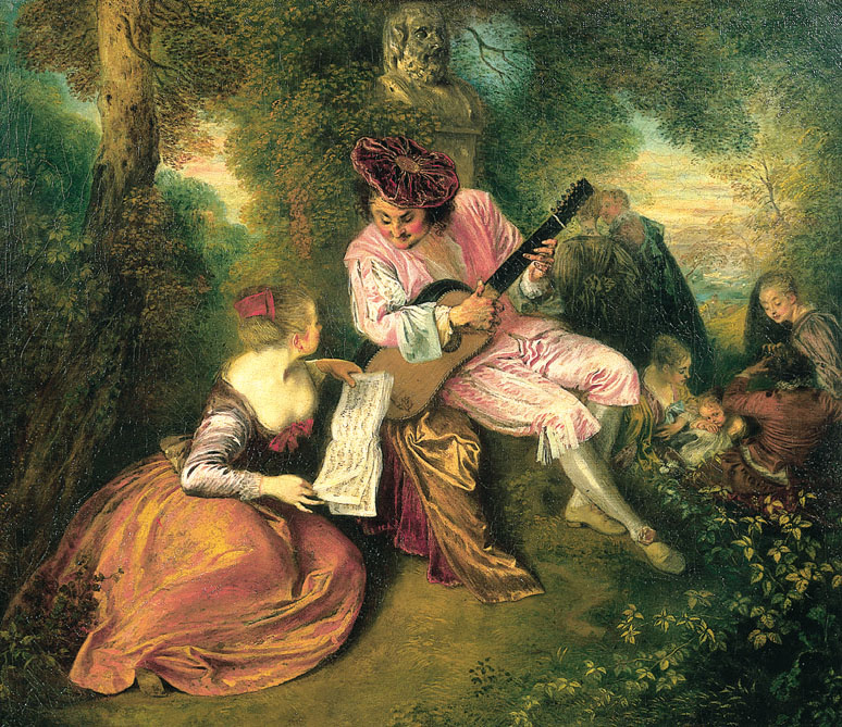 La Gamme d'amour (1715-1718), huile sur toile d'Antoine Watteau (National Gallery, Londres): une atmosphère de fête galante où la vie mondaine est comme poétisée.