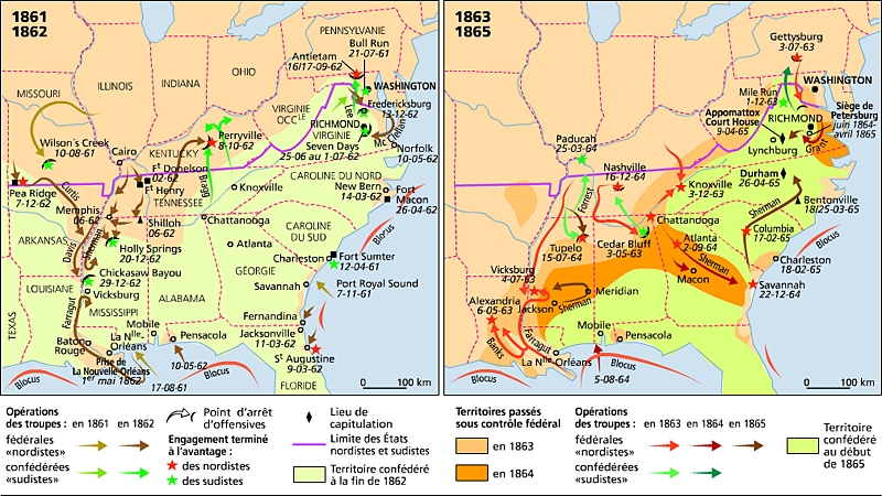 La guerre de Sécession éclate à la suite des bombardements de Fort Sumter, devant Charleston, par les sudistes (12 avril 1861). Elle va opposer, pour la première fois au monde, des armées aux effectifs approchant ou dépassant le million. Après des échecs initiaux, les nordistes l'emportent à partir de 1863, et, en 1865, le généralissime sudiste, Lee, sollicite un armistice, qui met fin à la guerre (9 avril).