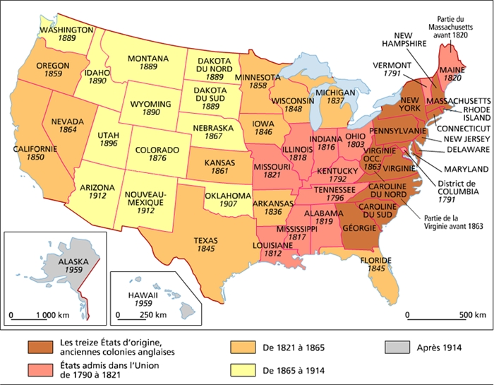 Résumé xvie-xviie siècles : la période coloniale Peuplé peut-être d'environ 4 millions d’Amérindiens, l’espace nord-américain fait l’objet de convoitises européennes dès le xvie siècle et d’implantations coloniales au xviie siècle. Ce sont finalement les Britanniques qui dominent. Sous leur pression, les Français sont amenés à livrer le Canada (1763) et les tribus autochtones de l’est à se replier vers les Appalaches et l’ouest. L'accession à l'indépendance En demandant aux colons nord-américains de contribuer au financement de leur défense, les responsables politiques de la métropole s’aliènent un nombre croissant de « patriotes » qui ne tardent guère à s’insurger et à rompre les liens avec Londres, en déclarant leur indépendance (1776). À l’issue d’une guerre de décolonisation soutenue officiellement par la France à partir de 1778, la Grande-Bretagne est forcée de reconnaître la souveraineté des 13 États-Unis d’Amérique (1783), tout en conservant le contrôle du Canada où se replient des dizaines de milliers de loyalistes. 1787-1861 : l'expansion territoriale Dotée d’une Constitution républicaine écrite en 1787, la jeune nation peut se concentrer sur son propre développement, acquérant et intégrant continûment des territoires à l’Ouest (acquisition de la Grande Louisiane en 1803, obtention de la Floride en 1819, partage de l’Oregon en 1846, gain militaire contre le Mexique du Sud-Ouest en 1848, achat de l’Alaska à la Russie en 1867 et annexion de Hawaï et d’une série de bases et d’espaces associés dans les Caraïbes et le Pacifique à l’issue de la guerre avec l’Espagne en 1898) qui s’avèrent riches de multiples de ressources. 1861-1919 : l'émergence d'une grande puissance À la faveur d’un développement démographique en partie lié à de puissantes vagues d’immigration, et malgré une guerre civile sanglante qui oppose nordistes et sudistes à propos de la prééminence de l’Union sur le droit des États et la question de l’esclavage (1861-1865), émerge une grande puissance agricole, commerciale et industrielle qui fait office de laboratoire de la modernité, et produit un mode de vie particulier, fondé sur la démocratisation de la consommation, l’American Way of Life. 1919-1929 : l'isolement dans la prospérité L’isolationnisme traditionnel, qui détournait les États-Unis des affaires européennes, cède une première fois en 1917 quand ceux-ci s’engagent aux côtés des Alliés. Déçus par les conditions de la paix, ils se consacrent à nouveau au développement intérieur. 1929-1945 : de l'isolationnisme à la Seconde Guerre mondiale À partir de 1929, les États-Unis doivent faire face aux déséquilibres de cette croissance effrénée et à la plus grave crise économique de leur histoire, non sans affecter par contrecoup l’ensemble du monde. Le « New Deal » et ses mesures qui ébauchent une amorce d’État providence leur permettent toutefois, avec la Seconde guerre mondiale dans laquelle ils s’impliquent à partir de décembre 1941, de surmonter cette « Grande Dépression » et de consolider leur statut de superpuissance.