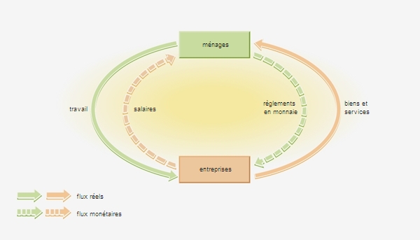 D'autres circuits peuvent décrire les interactions entre agents économiques, par exemple entre les ménages et les entreprises. Les ménages offrent leur travail aux entreprises, qui leur versent un salaire. Les entreprises produisent des biens et des services, qu'elles vendent aux ménages qui les achètent. Ces relations mettent en rapport deux types de flux : les flux réels et les flux monétaires. Dans cet exemple, les flux réels représentent le travail vendu par les ménages ainsi que les biens et services vendus par les entreprises. Les flux monétaires sont constitués par les salaires et les dépenses des ménages.
