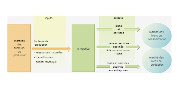 La production est définie par l'Institut national de la statistique et des études économiques (I.N.S.E.E.) comme l'activité, socialement organisée, qui consiste à créer des biens et des services s'échangeant sur le marché. La production est créée par les entreprises et, très marginalement, par les administrations publiques en ce qui concerne les biens collectifs. Pour les besoins de la production, les chefs d'entreprise se procurent, aux prix du marché, des ressources appelées « facteurs de production » (inputs, ou intrants). Ces derniers comprennent le travail humain et le capital physique ou matériel. L'entrepreneur réalise une combinaison productive associant le travail des hommes et le capital technique, c'est-à-dire les machines et instruments indispensables à la production. De la combinaison productive sont issus les produits (outputs) destinés à la vente sur les marchés.