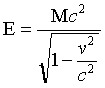 ; où c est la vitesse de la lumière. Pour v = 0, l'énergie n'est pas nulle et vaut E0 = M c2, appelée énergie au repos ou énergie de masse. Cette relation, inconnue en mécanique classique, implique une équivalence entre masse et énergie, qui peuvent se transformer l'une dans l'autre : ce type de transformation est courant en physique nucléaire et en physique des particules. Une autre conséquence de la relation vitesse-énergie est l'impossibilité pour une particule de masse non nulle d'atteindre la vitesse de la lumière c, puisqu'il faudrait lui communiquer pour cela une quantité d'énergie infinie.