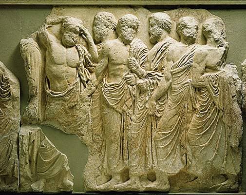 Le Parthénon est un temple périptère dorique en marbre pentélique. Il comprend : un pronaos, précédé d'une rangée de 6 colonnes ; la cella, qui abritait la statue chryséléphantine d'Athéna par Phidias ; la salle des Vierges, qui contenait le trésor de la déesse puis celui de la cité, ouverte à l'O. sur l'opisthodome, symétrique du pronaos. Les frontons et les métopes étaient sculptés et sur la frise intérieure se déroulait la procession des Panathénées (en majorité au British Museum). Toutes ces sculptures étaient peintes.