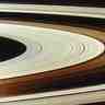 L'une des particularités de Saturne tient au vaste système d'anneaux qui l'entoure, découvert par Huygens en 1655. Ce système s'étend, dans le plan équatorial de la planète, jusqu'à plus de 300 000 km du centre de Saturne, mais avec une épaisseur inférieure à 1 km. De la Terre on n'a pu identifier que sept anneaux distincts, désignés par des lettres majuscules (A, B, C… ; seuls les deux premiers, très brillants, sont aisément visibles avec de petits instruments) et séparés par des divisions sombres, mais les photographies à haute résolution recueillies par les sondes spatiales révèlent que ces anneaux se subdivisent en fait en une multitude de très fins annelets. Ceux-ci sont constitués de blocs de glace « sale » (glace mêlée à des poussières, des fragments minéraux, etc.) qui gravitent indépendamment sur des orbites voisines, comme autant de petits satellites. Ils se différencient principalement par la densité de matière et les dimensions des corps qu'ils renferment (de quelques micromètres à plusieurs mètres). Sur les images spatiales, on y distingue de nombreuses irrégularités : variations d'épaisseur, hétérogénéités dans la distribution de matière, longues structures radiales temporaires tournant avec le champ magnétique, etc.