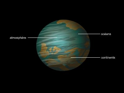 L'enveloppe gazeuse constitue l'atmosphère, formée d'éléments légers volatils, qui proviennent du dégazage du globe solide.