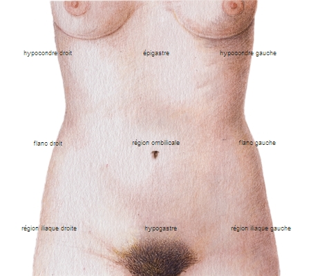 L'abdomen est la cavité située à la partie inférieure du tronc et contenant la majorité des viscères de l'appareil digestif et de l'appareil urinaire. (P.N.A. abdomen)