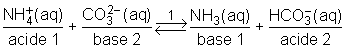 Par exemple, comme le pKA de NH4+/NH3 = 9,25 et que le pKA de HCO3−/CO32− = 10,32, la réaction :