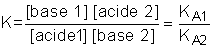 deux couples acide 1/base 1 et acide 2/base 2 sont en compétition pour s'emparer du proton de l'autre couple. La constante de l'équilibre est :