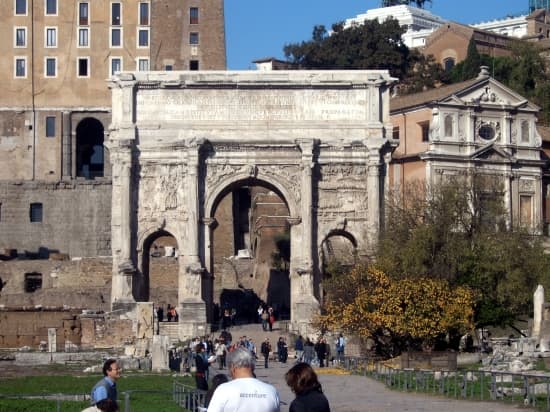 D'origine proprement romaine, les premiers arcs (constructions provisoires avant de devenir permanentes) se rattachaient à un rituel religieux pour ne conserver par la suite que la signification triomphale et commémorative de la victoire. L'arc le plus ancien fut érigé à l'entrée du Forum romain, sur la Voie sacrée, il célébrait la victoire d'Actium. L'arc de triomphe consiste en deux pylônes reliés par une voûte de plein cintre surmontée d'un attique qui supporte les statues. Certains arcs, à partir du ier s. avant J.-C., comportent trois baies (Rome [arc de Septime Sévère], Orange, Reims, Timgad), d'autres sont quadrifronts : quatre arches percées dans les massifs sont réunies par une coupole centrale (Rome, arc de Janus ; Tripoli ; etc.). Sur les pylônes sont plaquées des colonnes sommées d'un entablement qui encadre la voûte ; des bas-reliefs ornant parfois la paroi interne des baies complètent le décor sculpté.