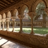 Le cloître est un des lieux privilégiés d'expression artistique, puisque la colonnade, initialement construite pour soutenir un auvent protecteur du soleil et de la pluie, est très tôt ornée. Y sont décorés les bases, les chapiteaux, les tailloirs, parfois les colonnettes et les pilastres. Certains cloîtres ne présentent qu'une sculpture ornementale, d'autres abritent de nombreuses scènes figurées d'inspiration religieuse. La galerie, dans un premier temps charpentée, est par la suite voûtée. Il existe quelques cas de double cloître, c'est-à-dire de galeries superposées liées à une église, elle aussi à deux niveaux, comme à Saint-Martin-du-Canigou.