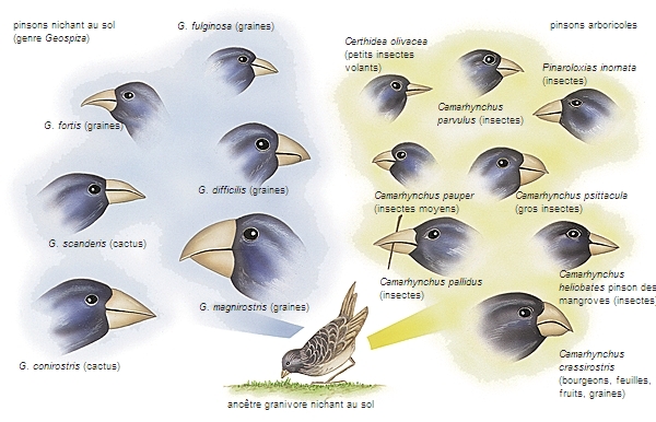 Les mâchoires des oiseaux forment un bec osseux, recouvert par un bec corné (ou rhamphothèque) souvent de la même forme. La forme du bec est liée au régime alimentaire : conique ou croisé pour ouvrir les graines, pointu pour percer le tégument des insectes, béant pour capturer les insectes en plein vol, filtrant chez le canard, dont les proies sont aquatiques, utilisé à l'envers chez le flamant, formant poche chez le pélican. C'est le type même de l'organe à « radiations adaptatives ».