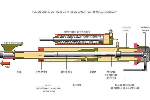 – le lien élastique, attelé à la bouche à feu et au berceau solidaire de l'affût, assure la stabilité au tir en limitant l'effort de recul. Il comporte un frein hydraulique ou à friction et un récupérateur à gaz comprimé ou à ressort ;