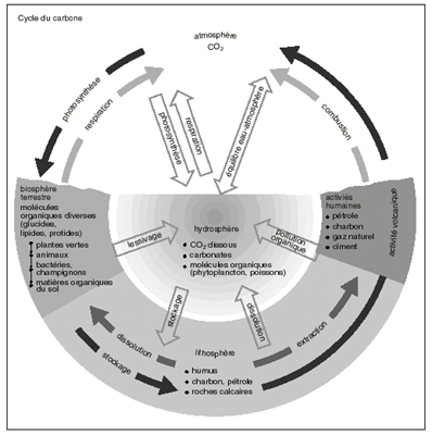 2° le cycle du charbon et du pétrole, dont la combustion par l'homme enrichit, elle aussi, l'atmosphère en CO2. De nos jours, l'ensemble des plantes vertes n'utilise pas la totalité du carbone ainsi dégagé.