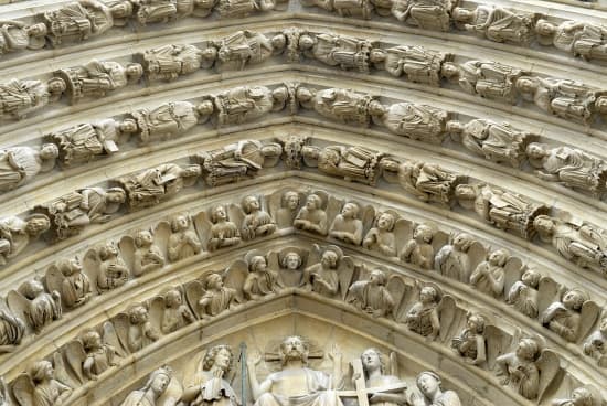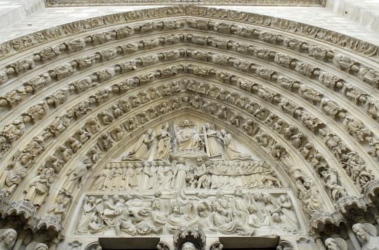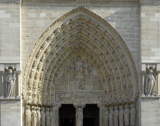 La façade principale, donnant vers l’ouest sur la place du Parvis Notre-Dame, de 40 mètres de long, offre une remarquable unité de composition. Trois portes s’y ouvrent : celle de la Vierge (à gauche), celle du Jugement dernier (au centre), et celle de Sainte-Anne (à droite). Des figurines d’anges et de saints remplissent les voussures, tandis qu’aux soubassements s’épanouissent des bas-reliefs consacrés aux Occupations du mois, représentant les Vertus et les Vices.