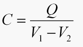 , avec C en farads (F), Q en coulombs (C), V1 et V2 en volts (V).