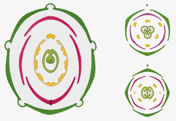 La figure de base d'un diagramme floral est une série de cercles (fleurs actinomorphes) ou d'ellipses (fleurs zygomorphes) concentriques. Chaque cercle est renforcé par le schéma des pièces d'un verticille floral : ovaire au centre, puis, en s'éloignant du centre, étamines, pétales et enfin sépales, ce qui informe d'un coup d'œil sur le nombre des pièces de chaque type, leur caractère soudé ou séparé, la position des ovules dans l'ovaire, etc.