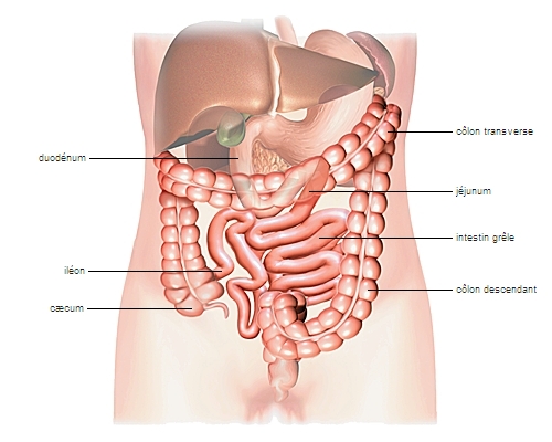 Les résidus non digérés des aliments passent ensuite dans le côlon, ou gros intestin. Celui-ci renferme une importante flore bactérienne qui assure notamment la fermentation des glucides non digérés précédemment (ce qui produit des gaz intestinaux). Il réabsorbe aussi l’eau et les ions utiles à l’organisme. Les déchets de la digestion sont expulsés sous forme de selles.