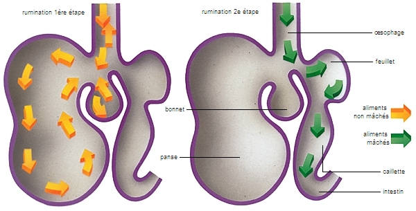 Chez les mammifères, le processus de digestion suit un schéma commun (voir la digestion humaine), à l’exception des ruminants. Ces derniers présentent en effet une digestion particulière qui leur permet d’assimiler la cellulose (principal composant de leur alimentation) : leur estomac est divisé en quatre compartiments (trois « pré-estomacs » et un estomac « vrai », la caillette), et ils mâchent, avalent puis régurgitent leurs aliments plusieurs fois, tandis que les bactéries symbiotiques de leur panse assurent la digestion de la cellulose.