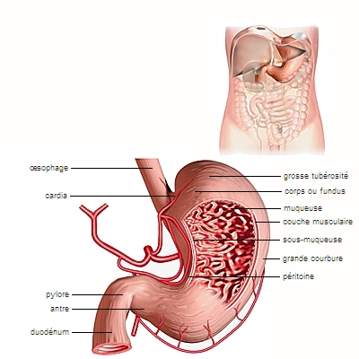Le processus de digestion commence dans la bouche par un broyage des aliments grâce aux mouvements de mastication des mâchoires. La mastication et le broyage sont facilités par la sécrétion de salive , augmentée au moment des repas. Celle-ci commence aussi la digestion de l’amidon, sucre complexe, en unités plus petites. Les aliments mastiqués sont ensuite déglutis pour tomber dans l’œsophage, qui débouche sur l’estomac. Là, ils sont brassés dans un liquide très acide au niveau de l'estomac, le suc gastrique (qui contient de l'acide chlorhydrique). Les enzymes du suc gastrique entament la digestion des protéines.