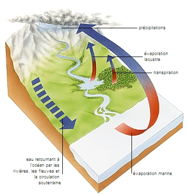 Provoquée par le rayonnement solaire, l'évaporation soustrait à tout moment de l'eau liquide aux océans (1 000 km3 par jour), aux lacs, aux rivières, aux surfaces humides, ainsi qu'aux sols et aux plantes (on parle plus précisément, dans ce dernier cas, d’évapotranspiration). La vapeur d'eau s'élève et circule, comme un gaz, dans l'atmosphère, où elle se condense au contact d'un air plus froid et donne naissance aux nuages. Dans certaines conditions et par l'effet de la pesanteur, cette eau regagne la surface des continents et des océans sous forme de précipitations (pluie, neige, grêle). Parvenue au sol, une grande partie (61 %) s’évapore ; le reste ruisselle (16 %) et rejoint les cours d’eau, ou pénètre dans le sol (23 %) où elle circule et alimente les nappes et les rivières souterraines. Ces flux souterrains hydratent les couches superficielles du sol, alimentent et renouvellent les nappes profondes, nourrissent les sources, soutiennent la vie des plantes, par lesquelles une partie de l'eau remonte dans l'atmosphère en changeant à nouveau d'état.