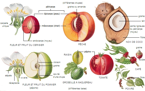 Le fruit, lui, ne se trouve que chez les plantes à fleurs, les seules plantes à posséder des ovaires, qui entourent les ovules. Le fruit est le résultat de la transformation, après la fécondation, de l'ensemble constitué par un ou plusieurs ovaires entourant un ou plusieurs ovules. Il protège la graine et assure la dissémination.
